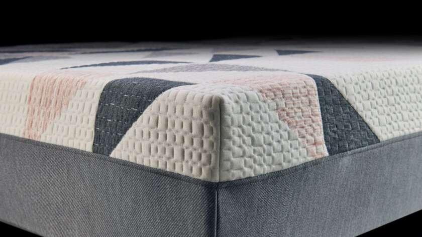 Close-up of the corner of a mattress with a textured white, pink, and gray top and a smooth gray fabric base against a dark background.