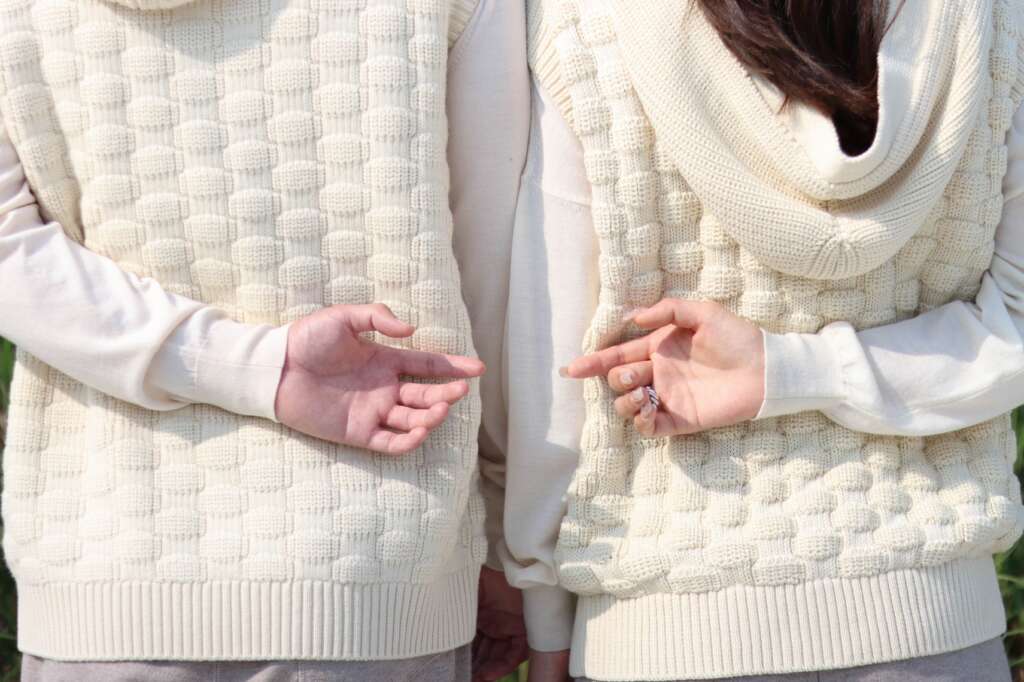 A man and woman stand outside with eyes closed, both wrapped in cozy cream sweaters made from soft Merino wool. They face opposite directions in a field of tall grass under a clear sky.